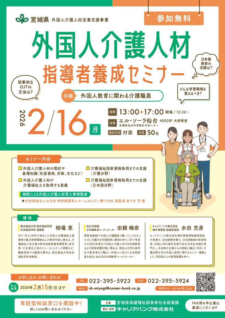 この度、仙台市内にて宮城県主催「外国人介護人材指導者養成セミナー」を開催いたします。 本セミナーでは、外国人教育に携わる介護職員の皆様を対象に、外国人労働者を取り巻く現状や、介護福祉士の国家資格取得に向けた具体的な支援方法について、専門の講師が分かりやすく解説いたします。実際に外国人材を雇用されている法人・事業所様は、ぜひご参加ください。